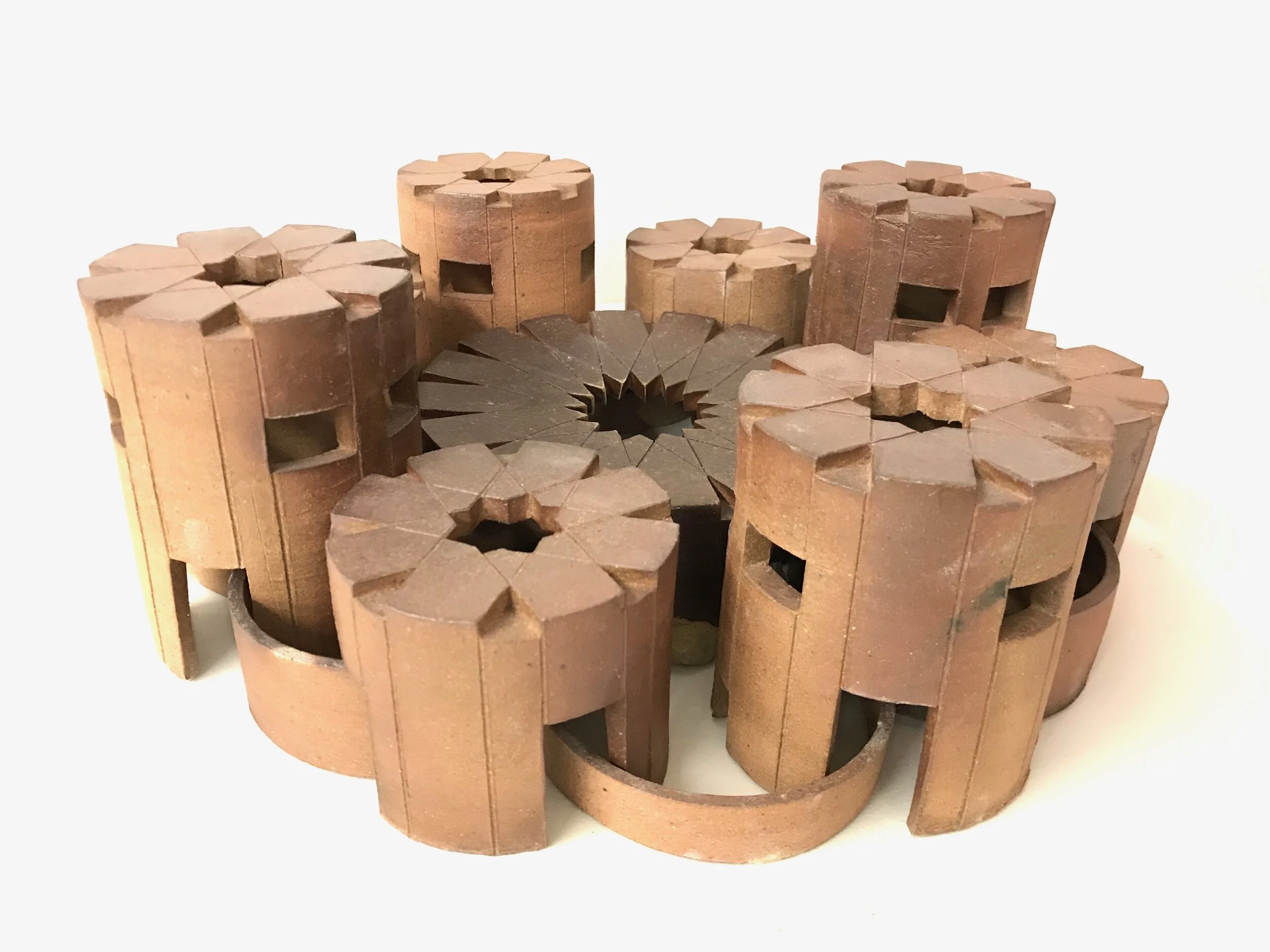 A study of the traditional Moroccan zellige tile making and drawing. Following the same lines, circles, and geometry used to draw a traditional pattern of sixteen point star, a three dimensional representation emerges. A wood fired finish gives a raw and earthen look to a contemporary take on a Moroccan tradition.