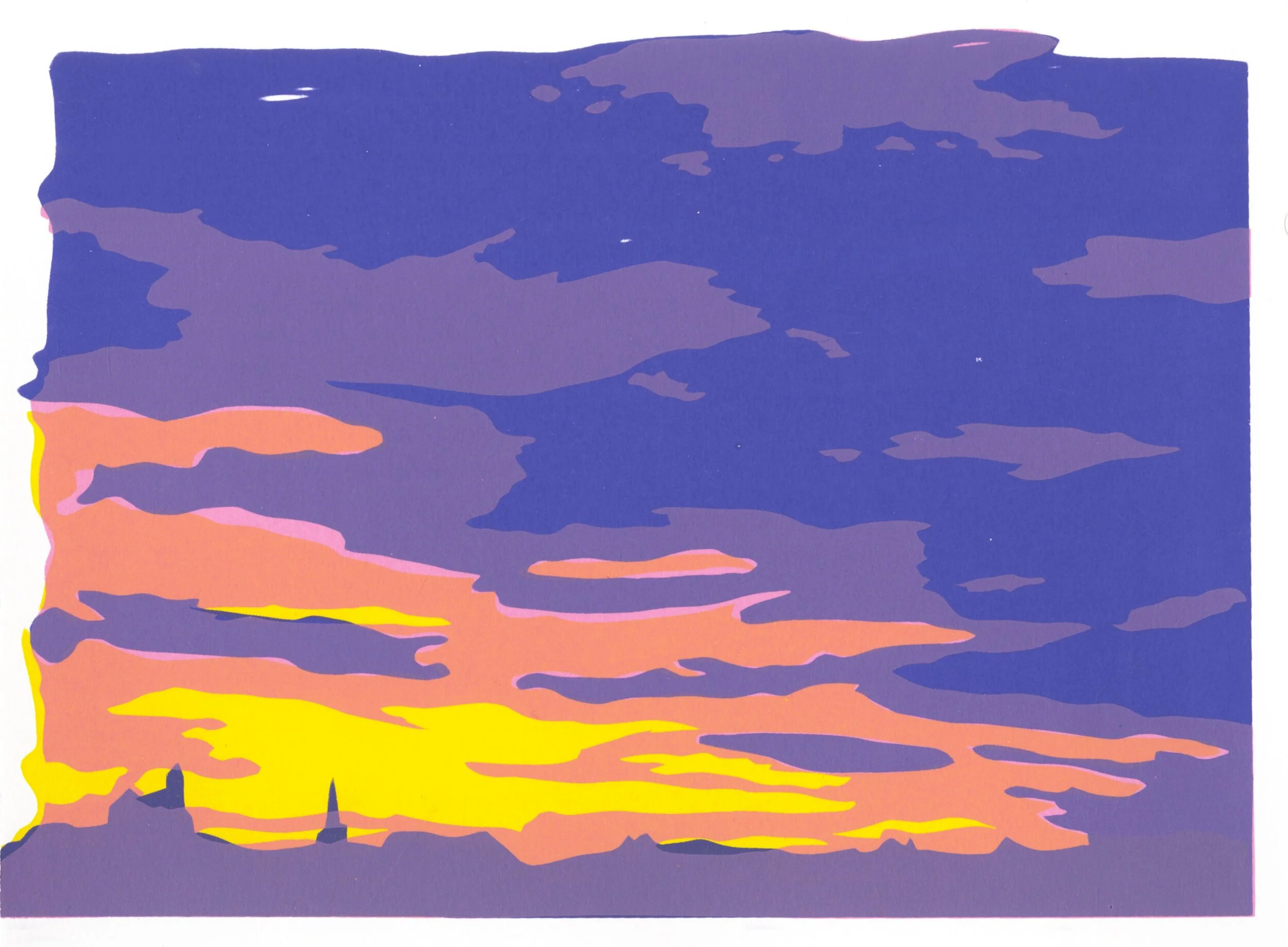 These screen prints convey the moment when the sun has set and the colors of the sky interweave and blend together.